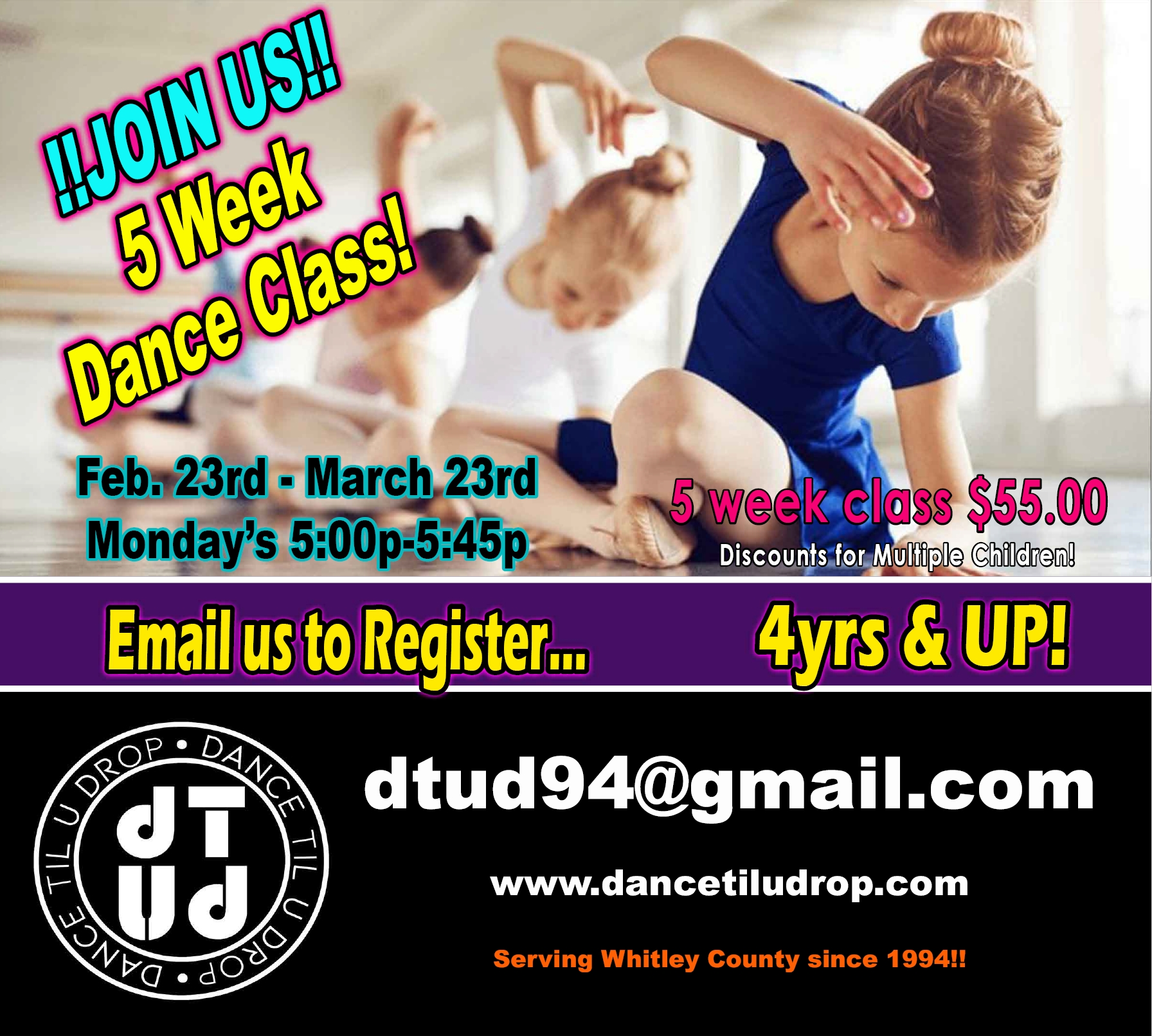 5 Week Dance Class for 4yo & Up! Reserve your spot by submitting payment today! Limited Availability. Monday's 5p-5:45p (Feb. 23 - Mar. 24) All Welcome to Participate!