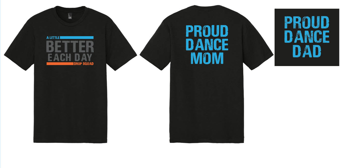 Show your Studio Spirit with a "Proud Dance Mom" or "Proud Dance Dad" T-Shirt!! Black T-Shirt w/Full Color Front Logo, Very soft poly blend.